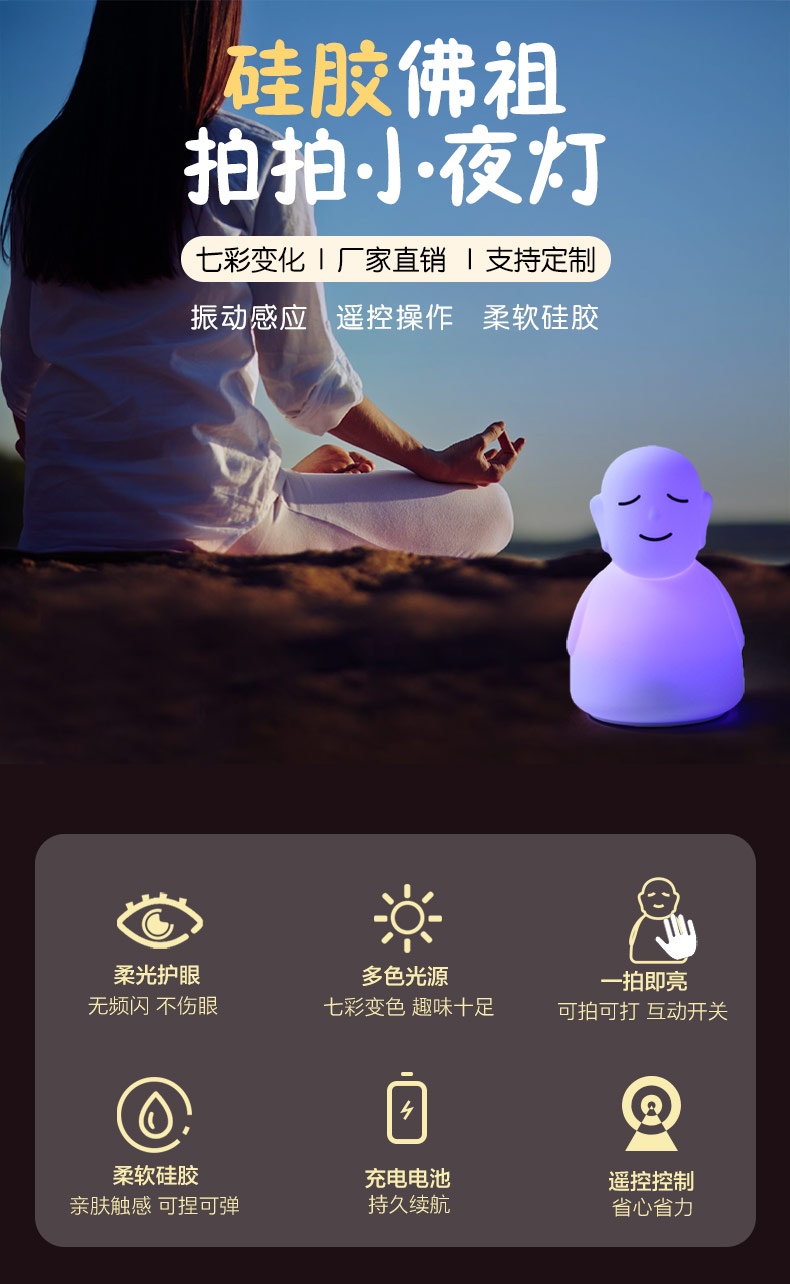 您的位置:首頁 > 產(chǎn)品中心 > 硅膠家居用品 > 拍拍燈 > 佛主拍拍燈夜間照明伴睡可充電遙控器遠程小夜燈